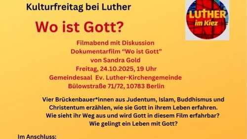Nette Menschen treffen sich im Begegnungshaus Luther zu einem Filmabend mit Diskussion. Im Mittelpunkt steht der Dokumentarfilm "Wo ist Gott?" von Sandra Lang.